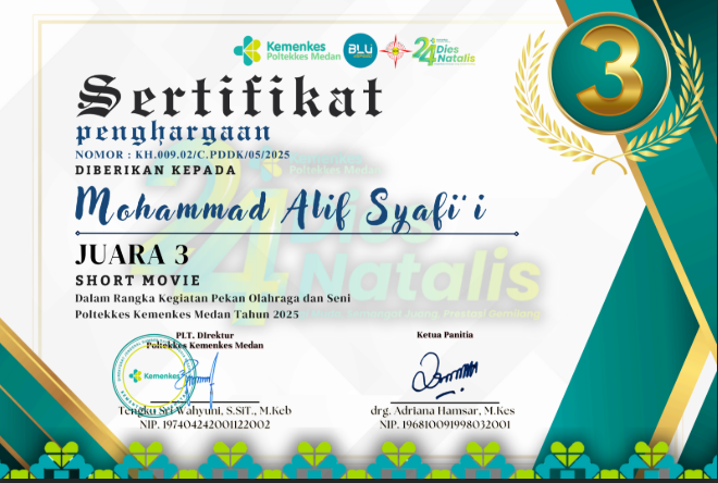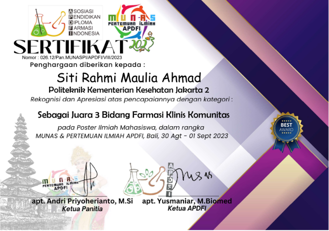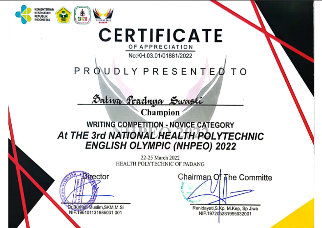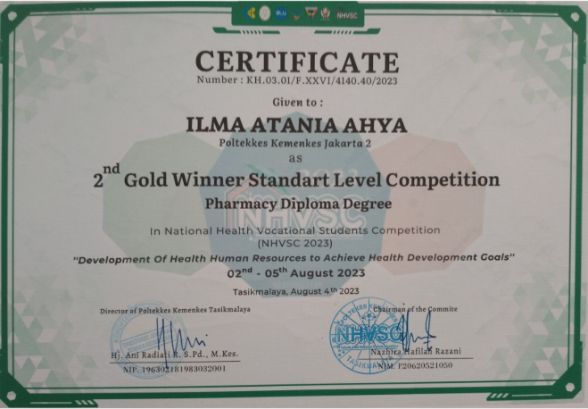 Tahun 2025 National Health Polytechnic English Olympic (NHPEO) Inklusivitas, Healthcare for Demokrasi (IHED) Tahun 2024 Gebyar Ilmiah Sains (GIS) 12th Kejuaraan Pencak Silat Nasional Lomba Ragam Kreasi dan Seni Anak Farmasi (RAKSA) Kejuaraan Teakwondo Nasional National Health Interprofessional Collaboration (NHIPEC) National Health Vocational Students Competition (NHVSC) Lomba Cerdas Cermat Farmasi (LCCF) Tahun 2023 Kejuaraan Teakwondo Nasional National Health Vocational Students Competition (NHVSC) National Polytechnic English Olympics (NPEO) Lomba Poster Ilmiah Nasional Asosiasi Pendidikan Diploma Farmasi Indonesia (APDFI) Tahun 2022 National Health Polytechnic English Olympic (NHPEO) National Health Vocational Students Competition (NHVSC)
